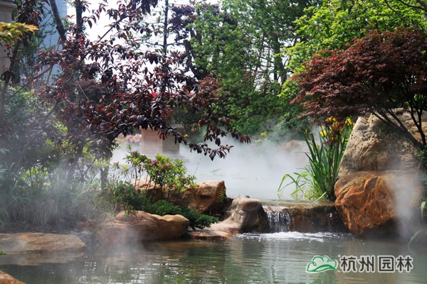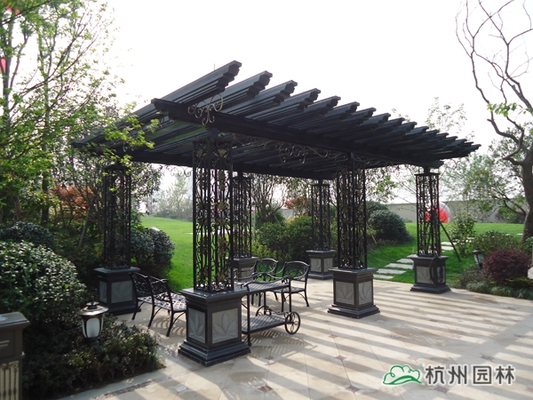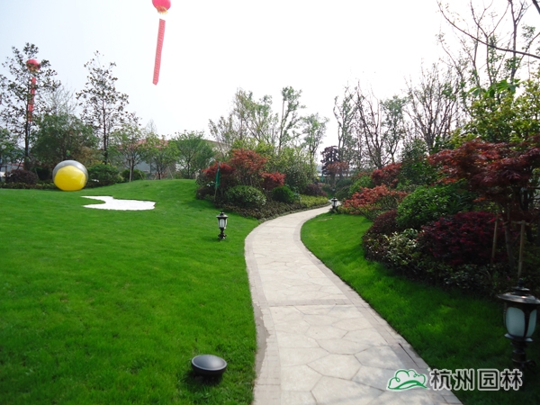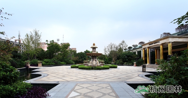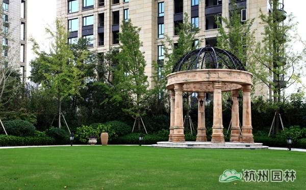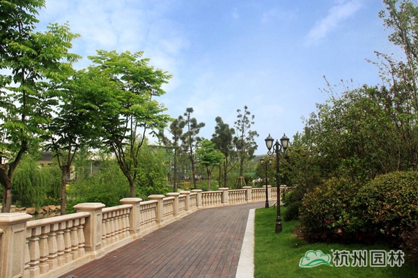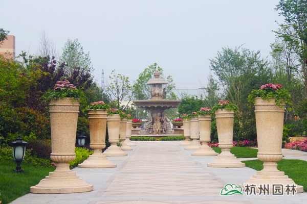 該工程位于杭州城北石祥路與蔡馬河交匯處,為大型綜合性園林景觀工程,內容包括園林建筑、苗木種植、硬質鋪裝、疊石跌水、景觀小品、土坡造型等。該項目景觀全方位采用規則式與自然式融合的維多利亞園林風格,如夢似幻,華貴雍容,將維多利亞皇家園林景觀特征表現得淋漓盡致。