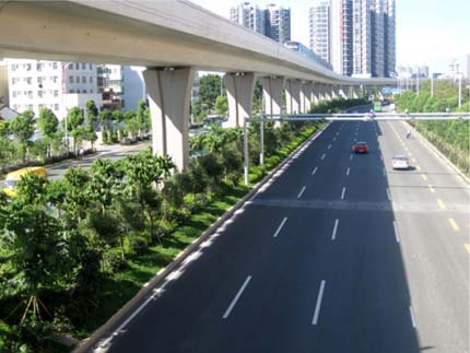 如今,開車行進在這條道路上,干凈整潔的路面、開闊通透的視野、清新自然的景觀,給人帶來閑適、愜意的感覺。“以人為本,尊重自然”的綠化理念,體現(xiàn)在景觀中的每個細節(jié);自然環(huán)境與城市環(huán)境的密切結合,使高架橋的道路通行功能與橋下中央綠化帶的生態(tài)功能有機融合。整條道路,不僅體顯出深圳這個濱海大都市獨有的景觀特色,更彰顯出這個城市的生機活力與熱情奔放。