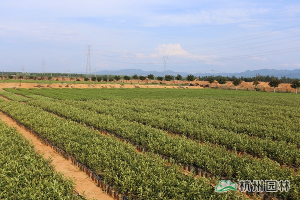 金華文廣苗木場位于浙江金華蔣堂鎮,面積1000畝,十五年專業種植、繁育、經營各種綠化苗木。基地中的桂花品種繁多,有金桂、銀桂、丹桂、四季桂、金球桂、狀元紅等,這些桂花蓬形密、長勢壯、造型好,冠伏在2米至5米的就達20萬株。香樟、杜英、無患子、紅玉蘭、紅葉石楠球等也達200畝。最吸引大家眼球的是基地中一排排排列整齊的寶塔形桂花樹,樹形獨特,長勢喜人。隨著市場的不斷變化,文廣苗木場不斷創新求變,通過修剪造型,培養出了寶塔形桂花,因此桂花銷量一直維持在較高水平。
