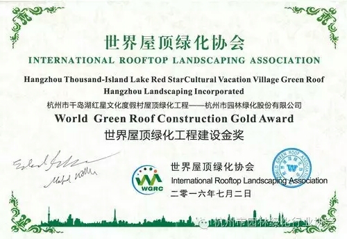 近日,在云南昆明召開的2016世界生態城市與屋頂綠化大會上,協會會員企業——杭州市園林綠化股份有限公司承建的杭州市千島湖紅星文化度假村屋頂綠化工程榮獲“世界屋頂綠化工程建設金獎”。